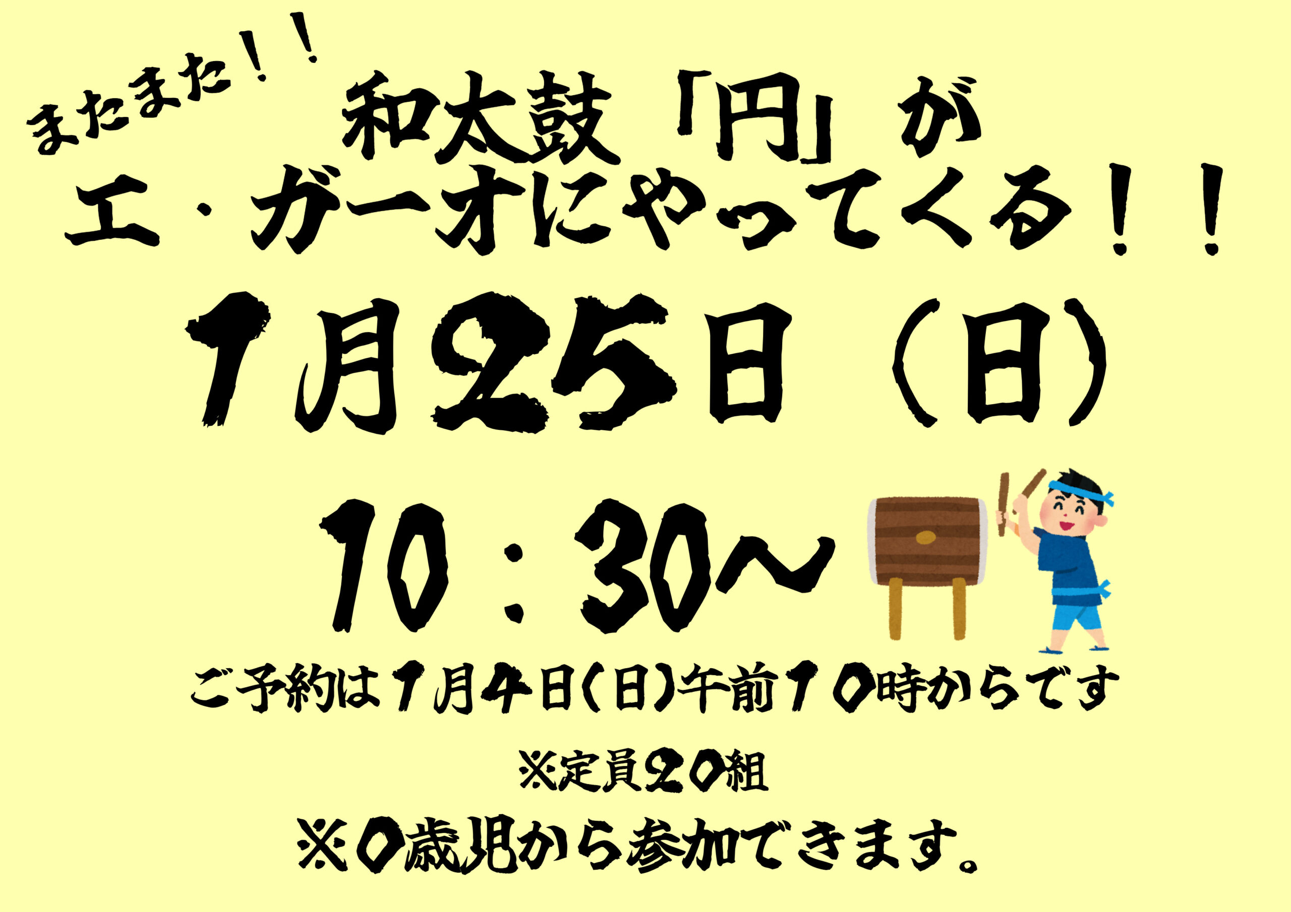 1月25日(日)に和太鼓「円」さんがやってきます!